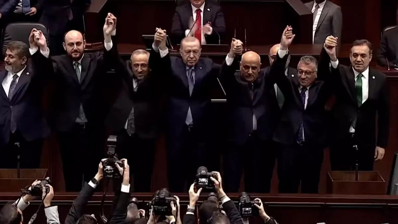 AK Parti yeni yılın ilk Meclis grup toplantısını yeni katılımları ile yaptı. CHP'den istifa eden Hasan Ufuk Çakır, DEVA Partisi'nden istifa eden İrfan Karatutlu ile Gelecek Partisi'nden istifa eden İsa Mesih Şahin'e parti rozetlerini Cumhurbaşkanı Erdoğan taktı.