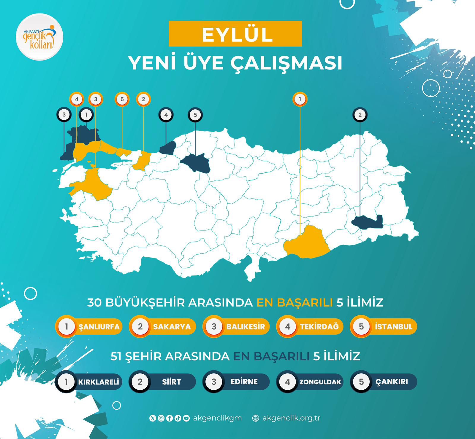 Türkiye genelinde 51 şehir arasında yapılan Eylül ayı yeni üye çalışması sonuçlarına göre AK Genç Zonguldak, 4. sırada yer aldı. Gençlik Kolları, elde edilen bu başarıyla teşkilatın dinamizmini bir kez daha ortaya koydu.