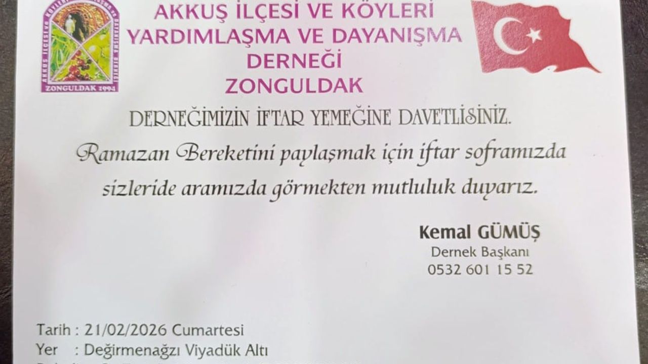 Dernek yönetimi, bu buluşmanın gönül köprülerini güçlendireceğini, dayanışma ruhunu büyüteceğini ve toplumda birlik mesajı vereceğini belirterek, “Haydi iftara Zonguldak’a… Bu anlamlı sofrada birlikte olalım” çağrısında bulundu.