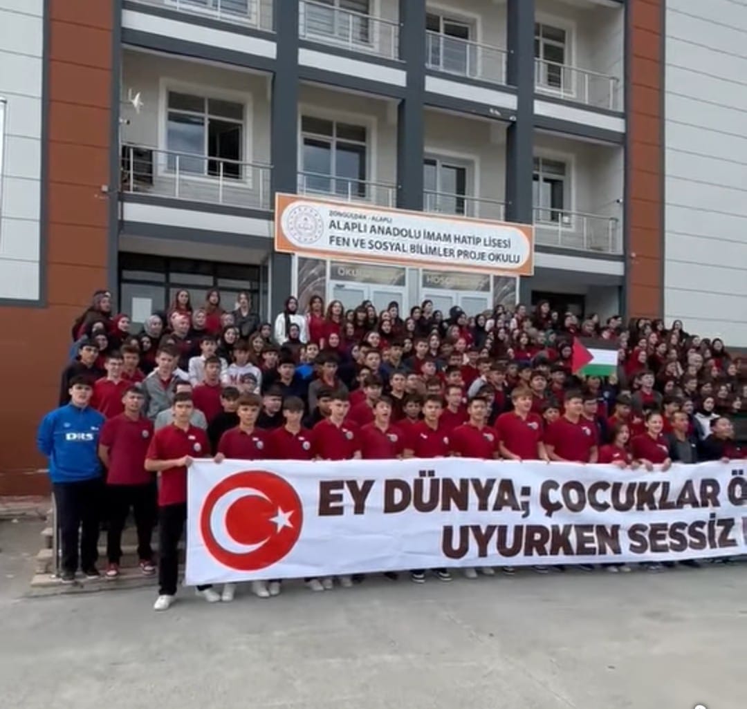 Filistin halkına yönelik saldırılara sessiz kalmayan Alaplı İmam Hatip Anadolu Lisesi öğrencileri, hem duyarlılıklarıyla hem de verdikleri güçlü mesajla takdir topladı. Okul yönetimi, öğrencilerin bu etkinliği tamamen kendi inisiyatifleriyle planladığını belirterek, gençlerin vicdani farkındalığına vurgu yaptı.