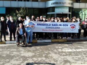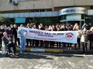 Zonguldak Atatürk Devlet Hastanesi önünde öğle saatinde bir araya gelen sağlık çalışanları adına bir basın açıklaması yapan Anadolu Sağlık Sen Zonguldak İl Başkanı Barış Fidan yapmış olduğu açıklamada şöyle dedi;