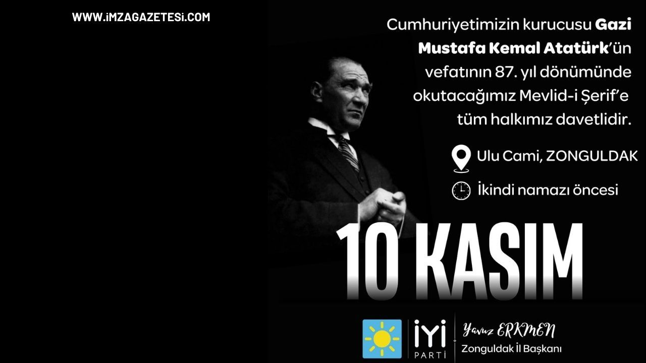 “Cumhuriyetimizin kurucusu Gazi Mustafa Kemal Atatürk’ün ebediyete irtihalinin 87. yılında, aziz hatırasını rahmet ve minnetle anıyoruz. Bu vesileyle, 10 Kasım Pazartesi günü ikindi namazı öncesinde Zonguldak Merkez Ulu Camii’nde düzenlenecek Mevlid-i Şerif programımıza tüm üyelerimizi ve hemşehrilerimizi davet ediyoruz. Rahmetle, minnetle...”
