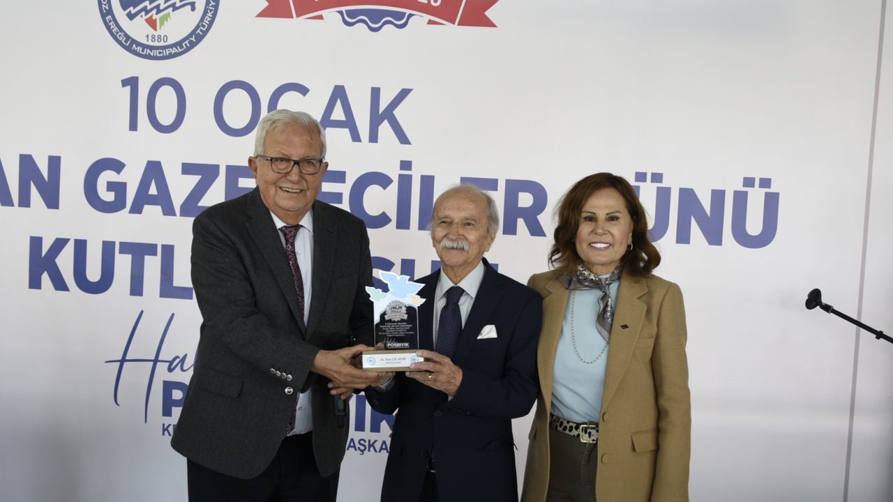 Başkan Posbıyık ve eşi Neriman Posbıyık, 25 yıl ve üzerinde Ereğli’de gazetecilik mesleğine emek veren Sina Çıladır, Necati Günay, Şafak Erel, Kurtuluş Ayyıldız, Hüseyin Orhan, Altan Akçakese, Ali Ceylan, Fikri Kapan, Doğan Gönüllü, Hasan Sarıalp, İsmet Keskin, Sinan Kabatepe, Mustafa Kemal Bektaş, Bilgin Avcı, Özge Cerrah, Serpil Kasapoğlu, Seyhan Dikay, İlknur Turt, Derya Gökbulut Sağlam, Tuncay Tokay, Yasin Ören, Serkan Aydemir, Yusuf Zobar, Muhammet Balaban, Ersen Berk Çelik, Elif Yapıcı, Hülya Çoker, Sibel Pınar, Arzu Tekin, Erdoğan Kutlu, Hakan Kurttekin, Hasan Haşıl, İbrahim Solmaz, Haydar Yağız, Recep Akkaya ve Şafak Negüzel’e ‘Basın Onur Ödülü’ plaketi takdim etti.