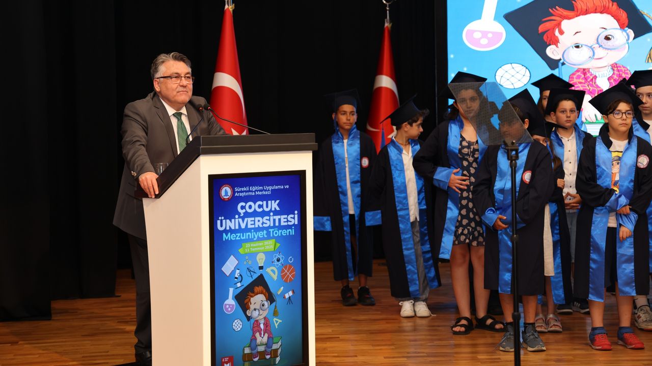 Çocuk Üniversitesi Mezuniyet Töreni'nin açılış konuşmasını gerçekleştirmek üzere kürsüye gelen BEUN Rektörü Prof. Dr. İsmail Hakkı Özölçer, “Çocuklarımıza bilimin, sanatın ve araştırmanın kapılarını araladığımız bu programla onların geleceğe daha donanımlı adımlarla ilerlemesine katkı sunmaktan büyük mutluluk duyuyoruz. Üniversite olarak yalnızca yükseköğretim değil, her yaş grubuna yönelik eğitimi desteklemeye devam edeceğiz.” dedi.