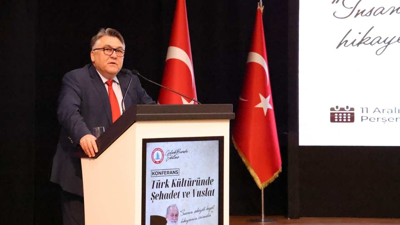 Açılış konuşmasının ardından konferansın konuşmacısı yazar Dr. Sait Başer kürsüye çıktı. Türk kültürü üzerine derinlikli bir perspektif sunan Başer, Mevlana’dan Dede Korkut’a uzanan köklü geleneğin bugün dahi yol göstericiliğini sürdürdüğünü ifade etti. Başer; “Tanrı kelimesinin çoğulu olmaz, kültürümüz buna müsaade etmez. Kültür; bir milletin yüzyıllar boyunca yoğurduğu tecrübenin adıdır. Türk kültürü köleliği tanımaz; adalet duygusuyla var olmuş bir medeniyetin ürünüdür.” sözleriyle kültür kavramının Türk-İslam düşüncesindeki yerine vurgu yaptı. Adaletin yalnızca hukuk değil, hayatın tamamını kuşatan bir denge ölçüsü olduğunu belirten Başer, Türkçenin köklü yapısının bu kavramla doğrudan ilişkili olduğunu ifade etti. Başer, konuşmasının sonunda Hz. Mevlana'nın özlü sözlerinden örnekler vererek vuslatının 752. yıl dönümü münasebetiyle Mevlana'yı rahmetle anıp sözlerini sonlandırdı.