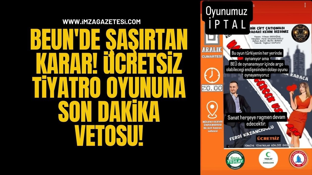 Zonguldak Bülent Ecevit Üniversitesi (BEUN), bu akşam sahnelenmesi planlanan “Haybeden Gerçeküstü Aşk” oyununu dekanlık kararıyla iptal etti.