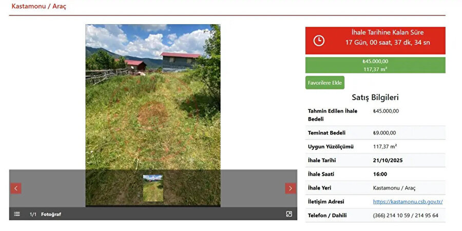 Milli Emlak Genel Müdürlüğü, Kastamonu ili Araç ilçesinde tahmin edilen ihale bedeli 45.000 TL'den arsa satılacağını açıkladı. Bu taşınmazın teminat bedeli 9.000 TL olarak duyuruldu.
