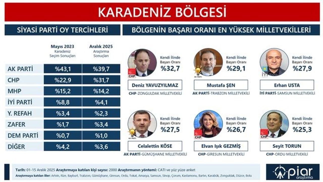 1–15 Aralık 2025 tarihleri arasında, 2 bin kişiyle CATI ve yüz yüze görüşme yöntemiyle gerçekleştirilen araştırmaya göre, Karadeniz Bölgesi’nin başarı oranı en yüksek milletvekili bir kez daha CHP Genel Başkan Yardımcısı ve Zonguldak Milletvekili Deniz Yavuzyılmaz oldu.