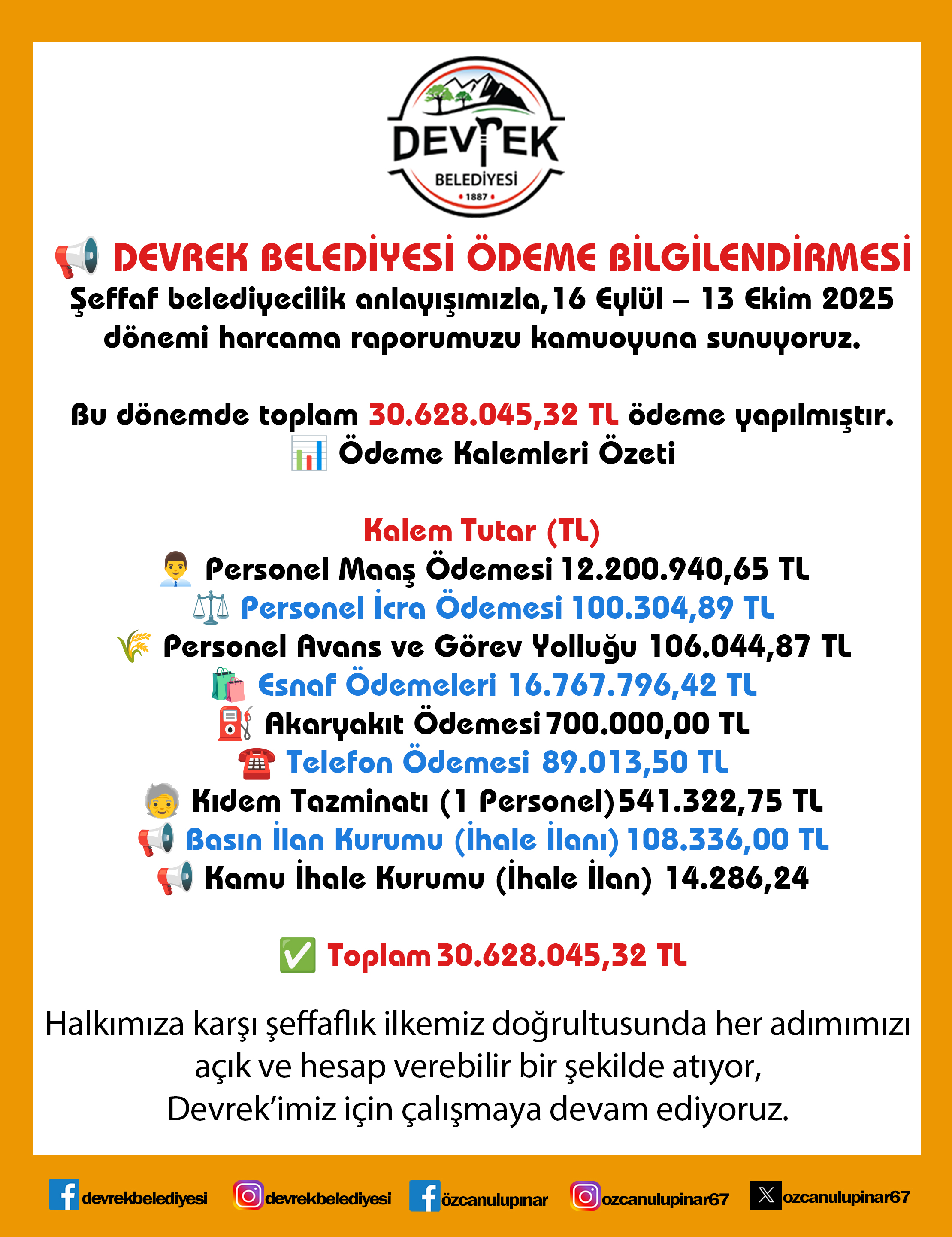 Devrek Belediyesi, şeffaflık ve hesap verebilirlik ilkeleri çerçevesinde mali işlemlerine ilişkin bilgileri kamuoyu ile paylaşmaya devam ediyor. Belediyeden yapılan açıklamada, 16 Eylül - 13 Ekim 2025 tarihleri arasındaki dönemde toplam 30 milyon 628 bin 45 TL ödeme gerçekleştirildiği duyuruldu.