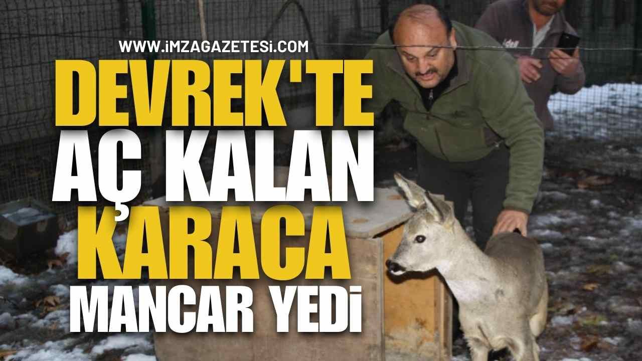 Zonguldak’ın yüksek rakımlı dağlarında yoğun kar nedeniyle aç kalan Karaca Devrek ilçesine bağlı Eğerci Köyüne inerek bir vatandaşın bahçesindeki manzaraları yedi.