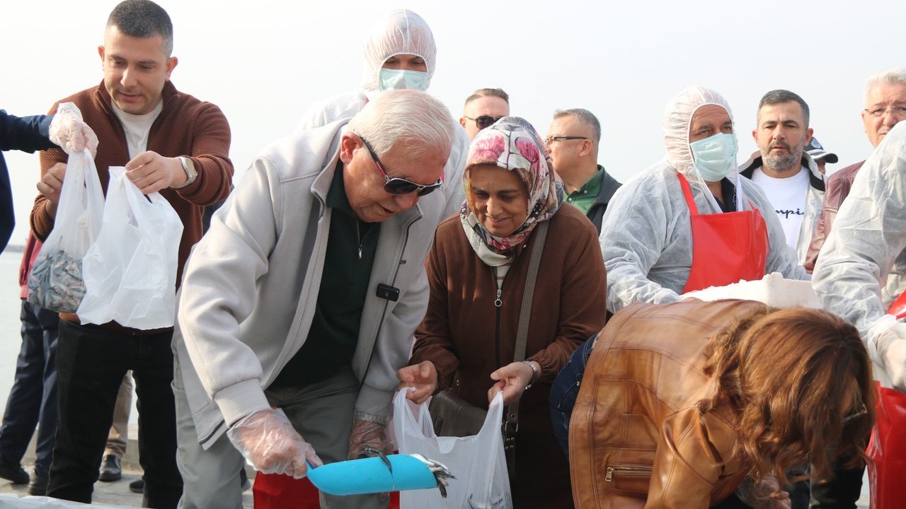Belediye Başkanı Halil Posbıyık, eşi Kadın Gücü Kooperatifi Başkanı Neriman Posbıyık, oğlu Tuğberk Posbıyık, CHP İlçe Başkanı Zerrin Yılmaz Erdoğan ve yönetimi, belediye başkan yardımcıları ve meclis üyeleriyle birlikte alana gelerek 10 bin ton hamsinin ücretsiz olarak halka dağıtılmasına start verdi.
