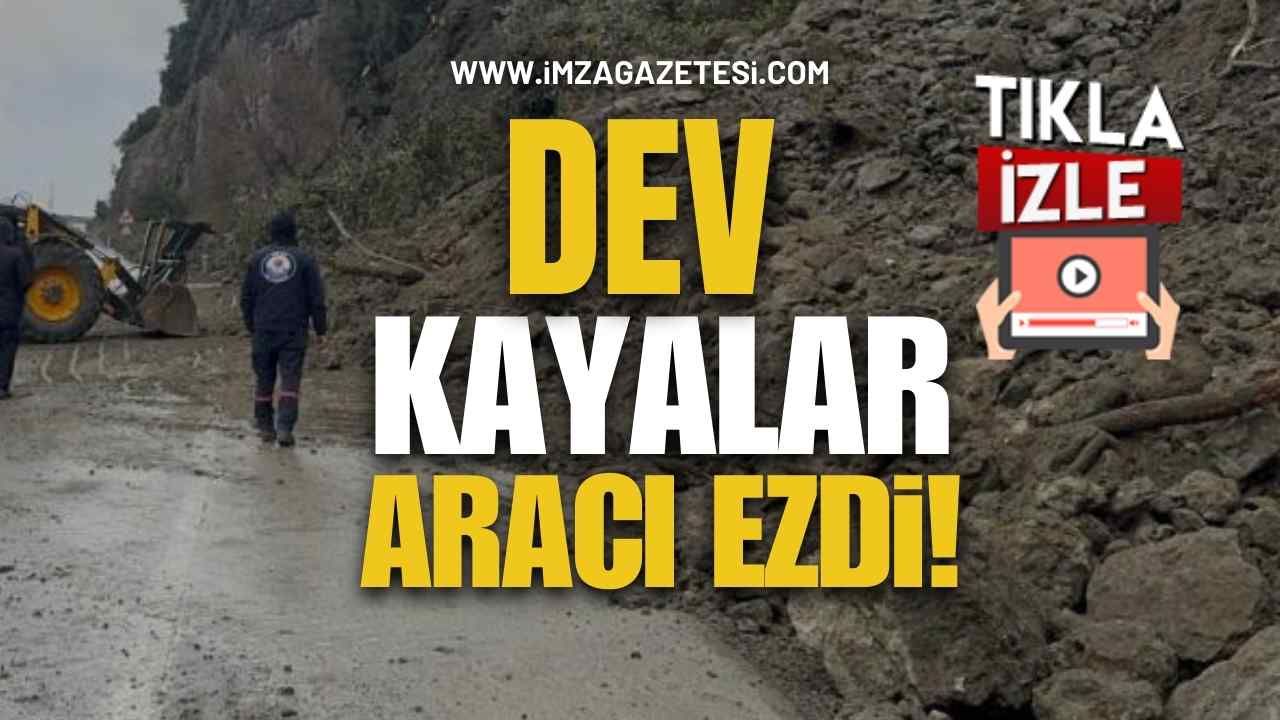 Yamaçtan kopan dev kaya parçaları o sırada yoldan geçen bir otomobile isabet ederken, facianın eşiğinden dönüldü.