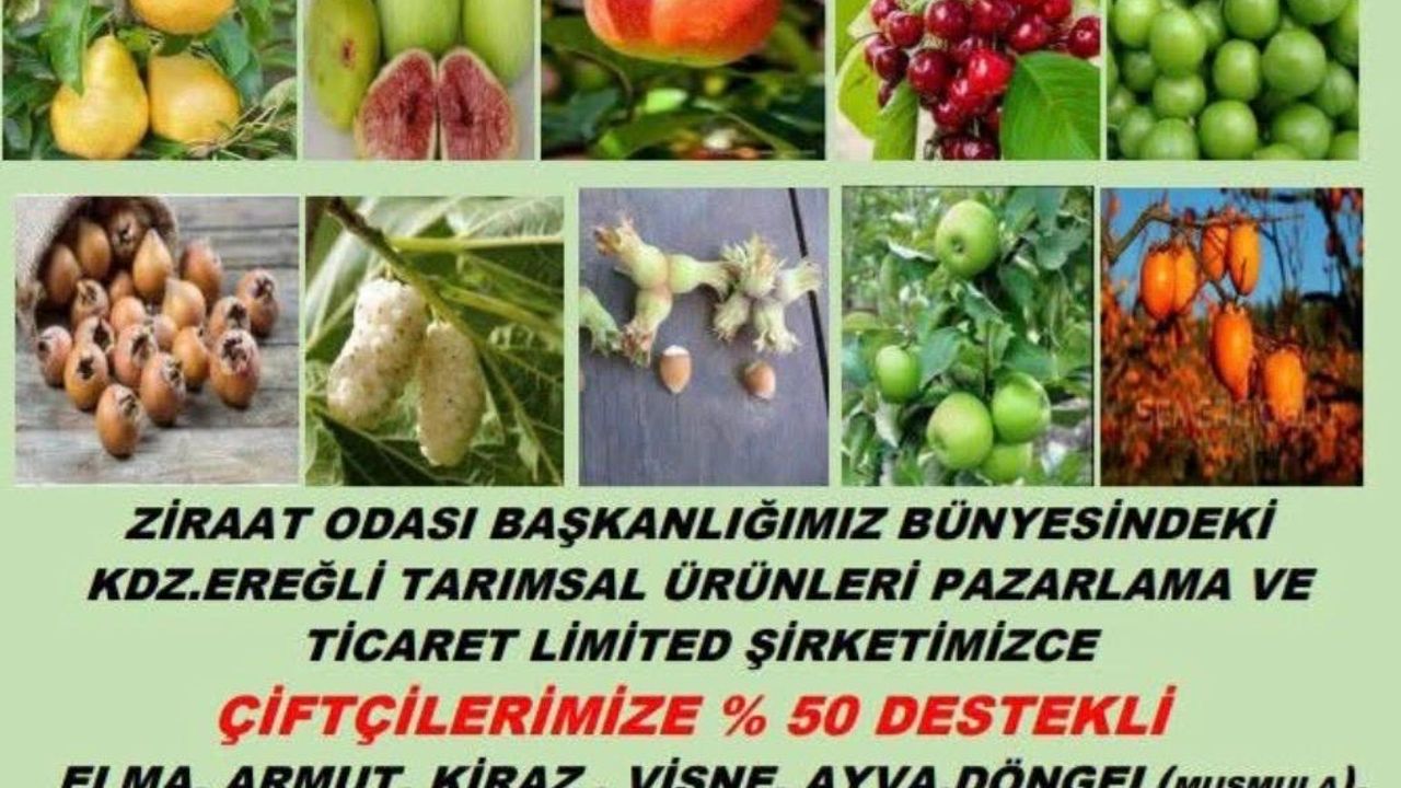 “Odamız başkanlığı bünyesindeki Karadeniz Ereğli Tarımsal Ürünleri Pazarlama ve Ticaret Limited Şirketimiz çiftçilerimize yüzde 50 destekli elma, armut, kiraz, vişne, ayva, döngel (muşmula), siyah dut, beyaz dut, siyah incir, beyaz incir, şeftali, nektari, kayısı, erik, hurma, nar, delisava fındık fidanı ve narenciye fidan çeşitleri satışlarımız başlamış olup almak isteyen çiftçilerimizin sipariş vermeleri önemle duyurulur.”