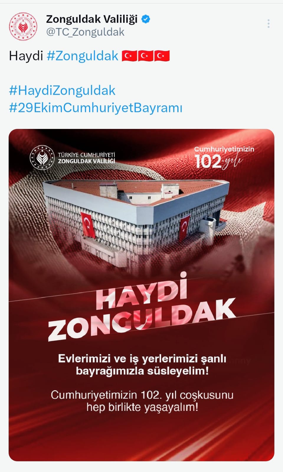 Valilik, paylaşımında, “Haydi #Zonguldak! Evlerimizi ve iş yerlerimizi şanlı bayrağımızla süsleyelim! Cumhuriyetimizin 102. yıl coşkusunu hep birlikte yaşayalım!” ifadelerine yer verdi. Vatandaşlar, sosyal medyada #HaydiZonguldak ve #29EkimCumhuriyetBayramı etiketleriyle paylaşımlarda bulunarak desteklerini gösteriyor.