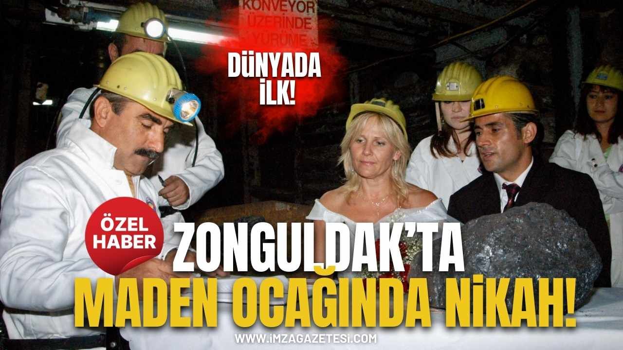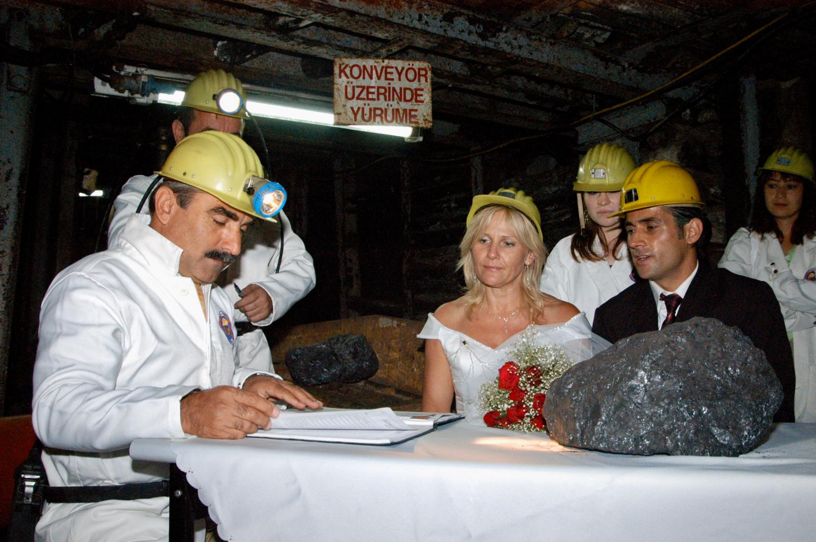 Zonguldak'ta, Türkiye Taşkömürü Kurumu (TTK) maden ocağına gelin ve damatlıkla giren çiftin nikahını, Zonguldak Belediye Başkanı Secaattin Gonca kıydı.