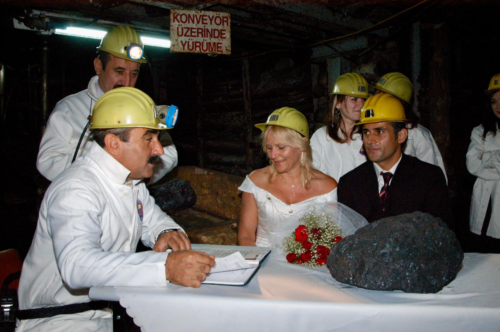 TTK Üzülmez Müessese Müdürlüğü Eğitim Ocağına, damatlık ve gelinliklerinin üzerine işçi ceketi, ayaklarına da çizme giyen ve başlarına madenci bareti takan Mustafa Savaş Sarıhan ile Alman uyruklu Elizabeth Brieden, şahitler ve bazı işçilerin katılımıyla ocakta oluşturulan tören alanına geldi. Belediye Başkanı Gonca, cübbe yerine işçi elbisesi giyerek, kendisiyle birlikte davetlilerin de başlarına taktığı baretlerin lambalarının ışığından faydalanılarak çiftin nikahını kıydı. Gonca evlilik cüzdanını gelin Elizabeth'e vererek, bir altın taktı. Alman geline tercüme yapılarak gerçekleştirilen nikah töreninin ardından, davetlilere eğitim ocağı gezdirilerek havzadaki taş kömürü üretimi ve çalışma koşulları hakkında bilgiler verildi.