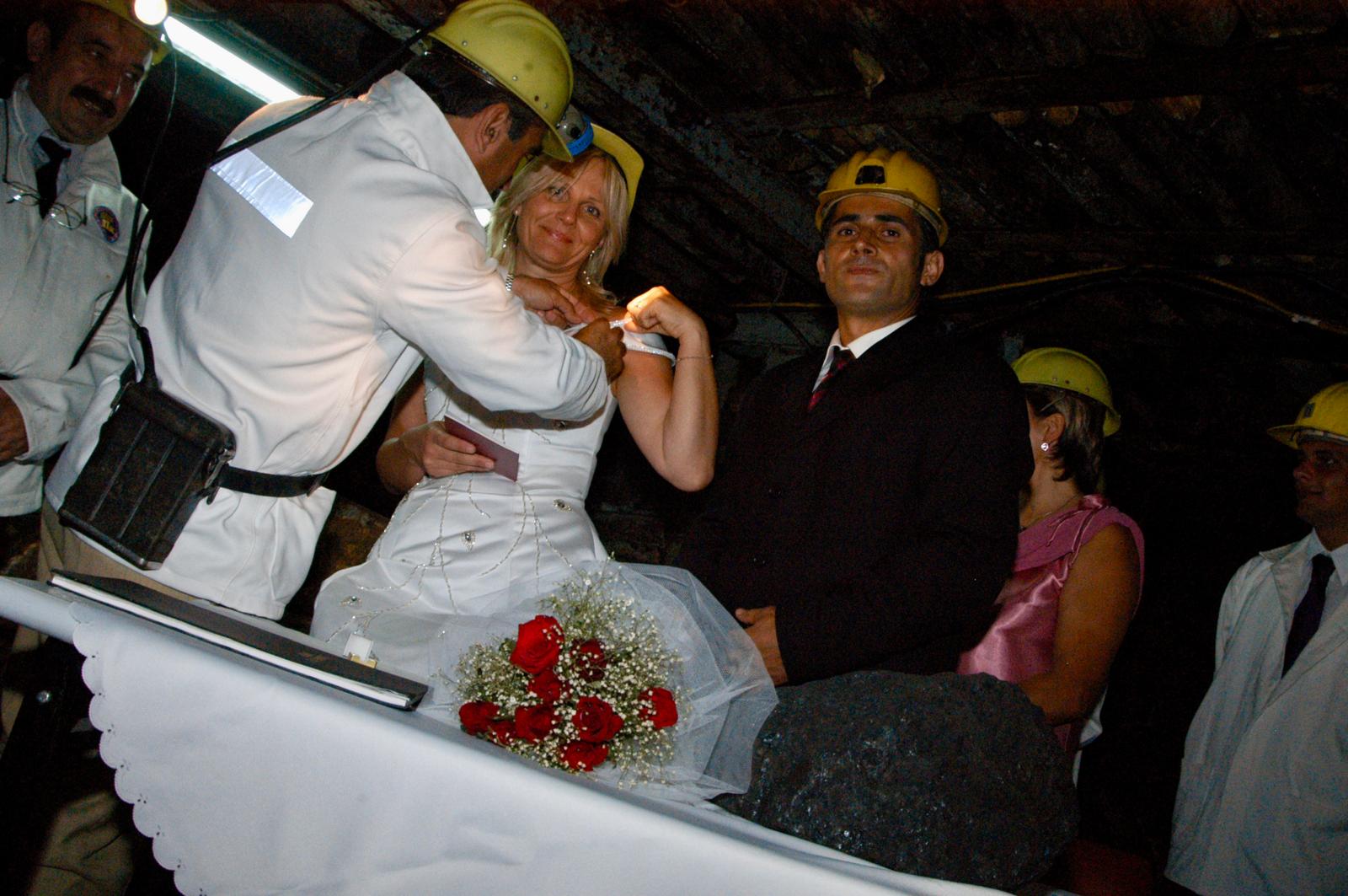 Gelinliğini ve damatlığını giyen çift ortama uygun kostümlerini tamamlamak için ayrıca üstlerine madenci ceketi, ayaklarına çizme giymışlerdi. Dahası güvenlik ön planda olmalıydı, simgesel yanı bır yana, iş güvenliği üzerınden de ayrıca olmazsa olmaz olan madenci baretleri de takıldıktan sonra tören için hazırdılar. Ben de aynı şekilde madenci ceketim, çizmelerim ve baretimle üzerime giydiğim cübbemle nikâhı kıymak için hazırdım.