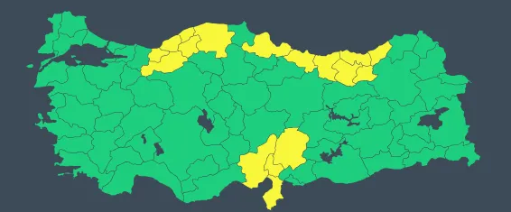 SARI KOD VERİLEN İLLER: Düzce, Bolu, Zonguldak, Karabük, Bartın, Kastamonu, Samsun, Ordu, Giresun, Trabzon, Rize, Artvin, Gümüşhane, Bayburt, Adana, Osmaniye, Hatay ve Kahramanmaraş.