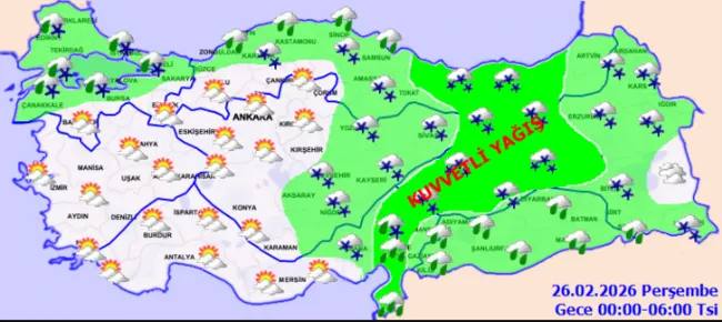 Parçalı ve çok bulutlu, yağmur ve sağanak yağışlı zamanla yüksekleri karlakarışık yağmur ve kar yağışlı geçeceği tahmin ediliyor. Yağışların doğusunda kuvvetli olması bekleniyor.