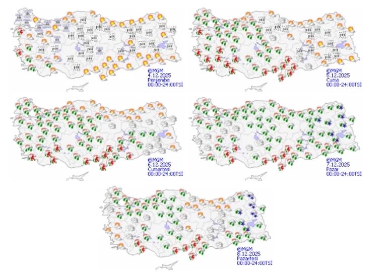 Perşembe günü öğle saatlerinden itibaren yurdun güneybatı kesimlerinden başlayan yeni bir yağışlı sistemin etkisi altına girileceğini belirten Macit, "Perşembe günü İzmir, Muğla ve Antalya'da başlayacak yağışlar, cuma günü Ege Bölgesi, Akdeniz Bölgesi ve Marmara'nın batısında görülecek. Yağışların, cumartesi yine Marmara'nın batısı, Ege Bölgesi, Akdeniz Bölgesi ve İç Anadolu'nun güneyinde, pazar günü ise yurt genelinde sağanak ve gök gürültülü sağanak şeklinde etkili olmasını bekliyoruz." dedi.