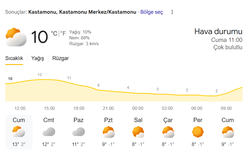 Kastamonu için detaylı nem,sıcaklık ve yağış oranı...