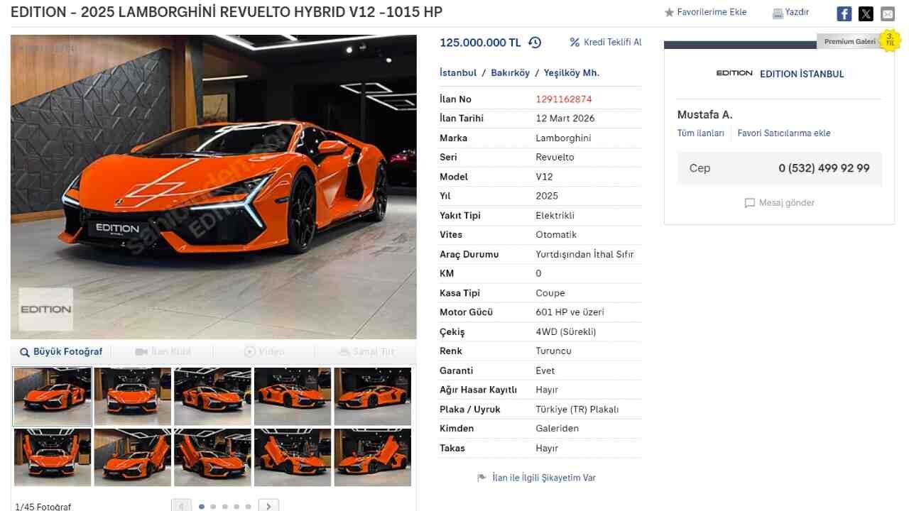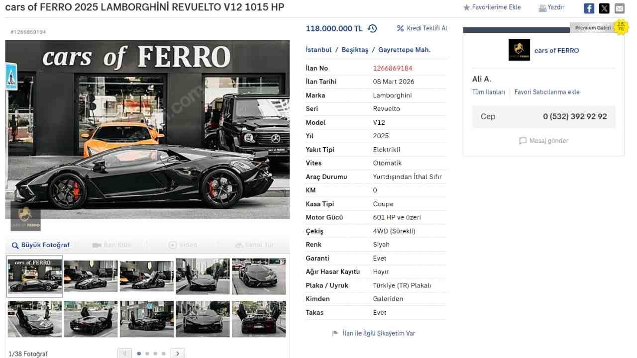 Beşiktaş Gayrettepe’de alıcısını bekleyen 2025 model siyah Revuelto, listenin üçüncü basamağında. Yurtdışından ithal sıfır kondisyondaki araç, 4WD çekiş sistemi ve elektrikli-benzinli hibrit motoruyla öne çıkıyor.