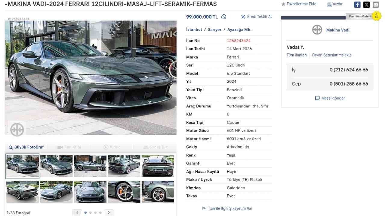 Listenin dördüncü sırasında İtalyan devi Ferrari’nin en yeni başyapıtlarından biri olan 12Cilindri yer alıyor. Ayazağa’da sergilenen yeşil renkli bu 2024 model araç, seramik frenleri ve masajlı koltuk opsiyonuyla dikkat çekiyor.