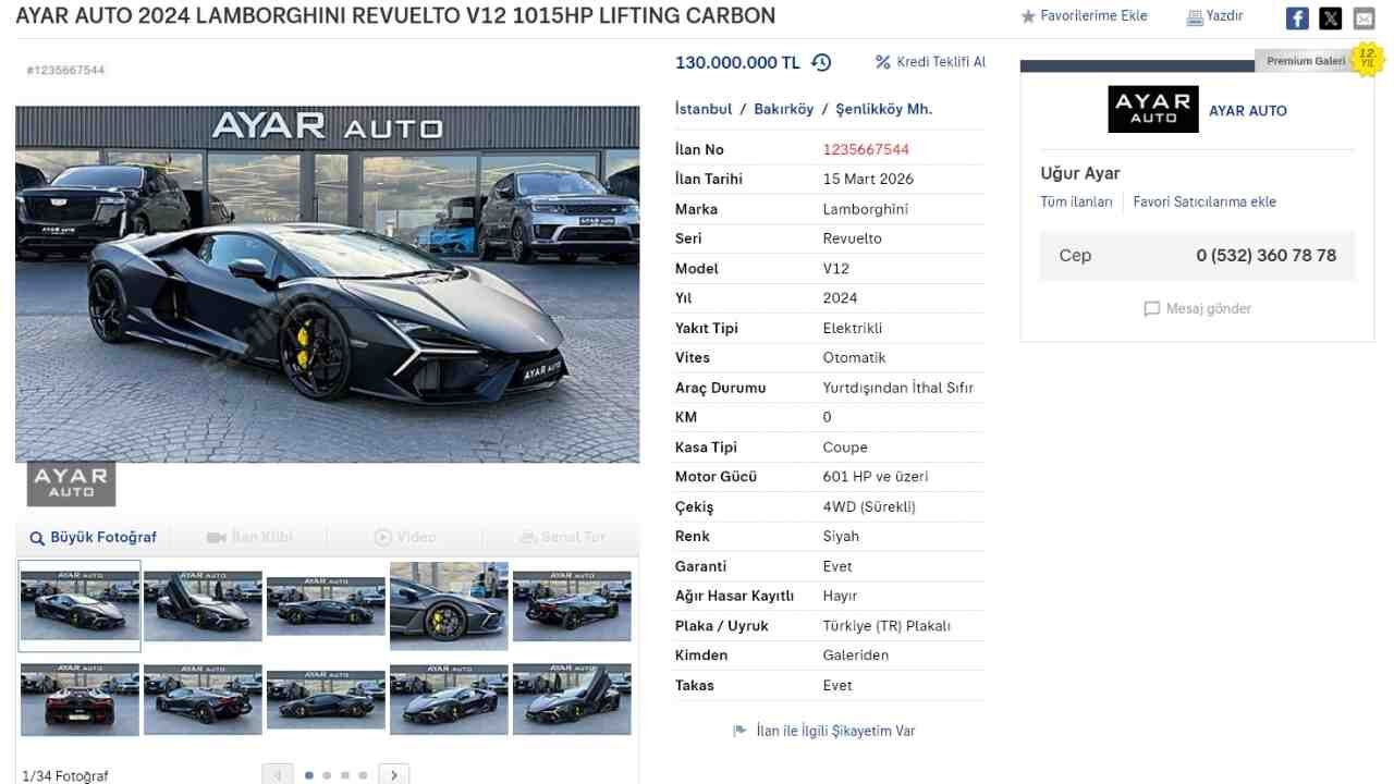 Listenin zirvesinde tam bir mühendislik harikası yer alıyor. Bakırköy’den ilan edilen bu 2024 model siyah Lamborghini Revuelto, 1015 beygirlik hibrit V12 motoruyla Türkiye’nin en pahalı ilanlarından biri.