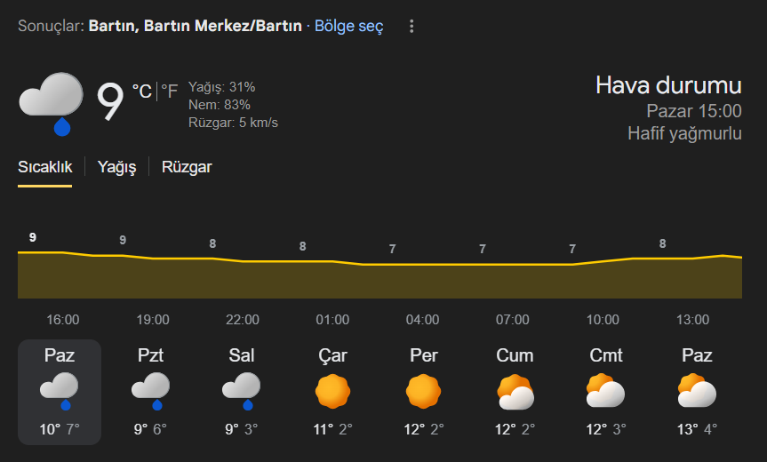 Batı Karadeniz'in incisi Bartın için hazırlanan haftalık hava durumu raporuna göre, kent bu hafta boyunca yoğun yağışın etkisi altında kalacak. Sıcaklıklar 3°C ila 10°C aralığında değişirken, çoğu gün kuvvetli sağanak yağış bekleniyor. Yağışların özellikle kıyı şeridinde etkili olması bekleniyor. Meteorolojik veriler, hafta sonuna doğru yağışın hafifleyerek yerini parçalı bulutlu bir havaya bırakabileceğini işaret ediyor. Deniz ve kıyı bölgelerindeki rüzgarın şiddeti zaman zaman artış gösterebilir.