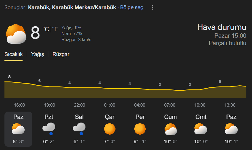 Karabük için yayınlanan haftalık raporda, kış mevsiminin iç kesimlerde daha sert hissedileceği belirtiliyor. Hava sıcaklıkları 0°C ile 10°C arasında dalgalanacak. Haftanın ilk günlerinde (Pazartesi, Salı) yağmur ve karla karışık yağmur bekleniyor. Gece sıcaklıklarının 0°C ve altına inmesi nedeniyle buzlanma ve don olaylarına karşı dikkatli olunması gerekiyor. Hafta ortası (Çarşamba, Perşembe) ise havanın açarak güneşli ve ayazlı bir seyir izlemesi bekleniyor.