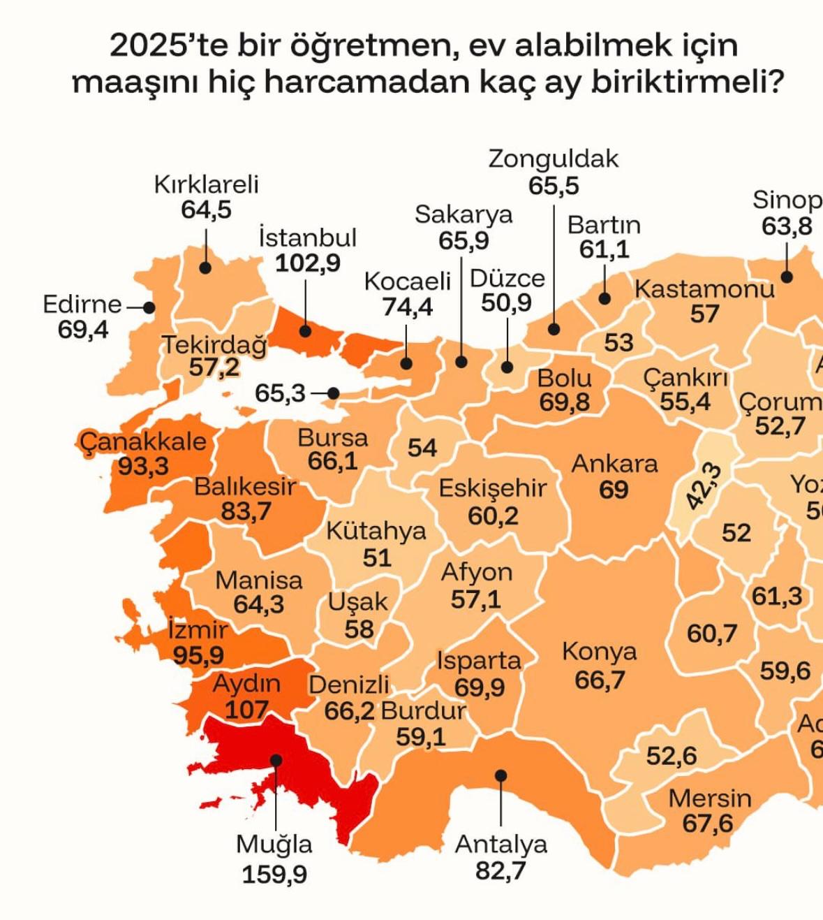Ülke genelindeki verilere göre konutların en pahalı olduğu il Muğla oldu. Muğla’da bir öğretmen ev sahibi olabilmek için yaklaşık 160 ay, yani 13,3 yıl boyunca maaşını hiç harcamadan biriktirmesi gerekiyor.
