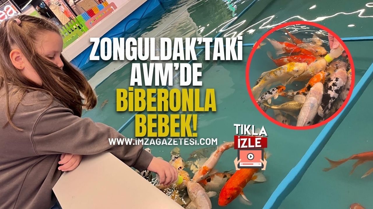 Zonguldak’taki Alışveriş Merkezi’nde (AVM), rengarenk Japon koi balıklarını biberonla bebek gibi beslemek için sıraya giriyorlar.