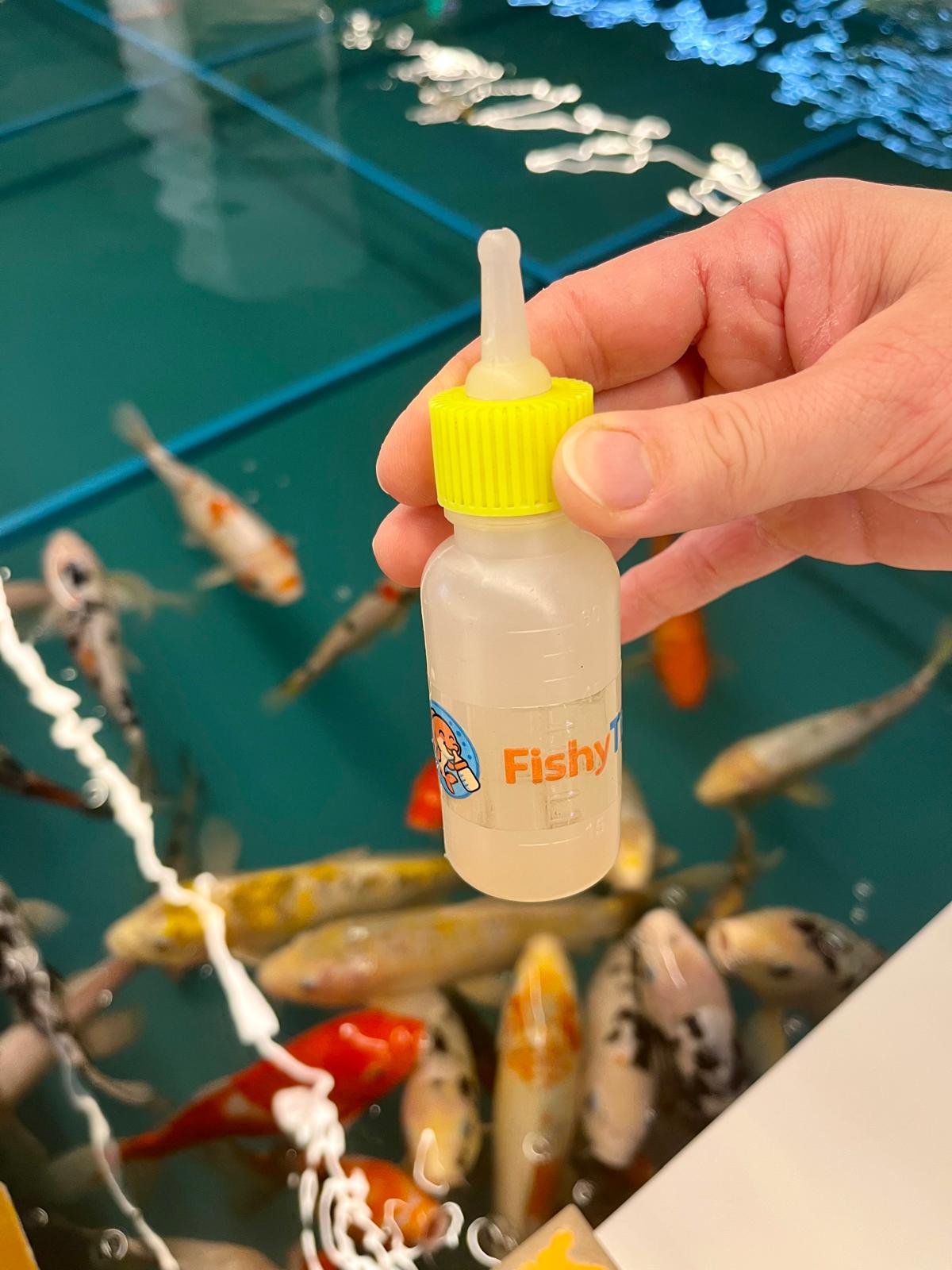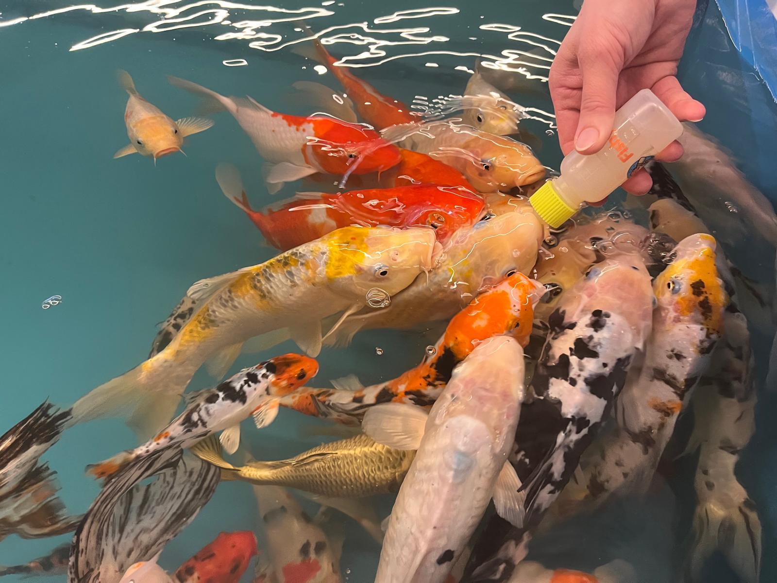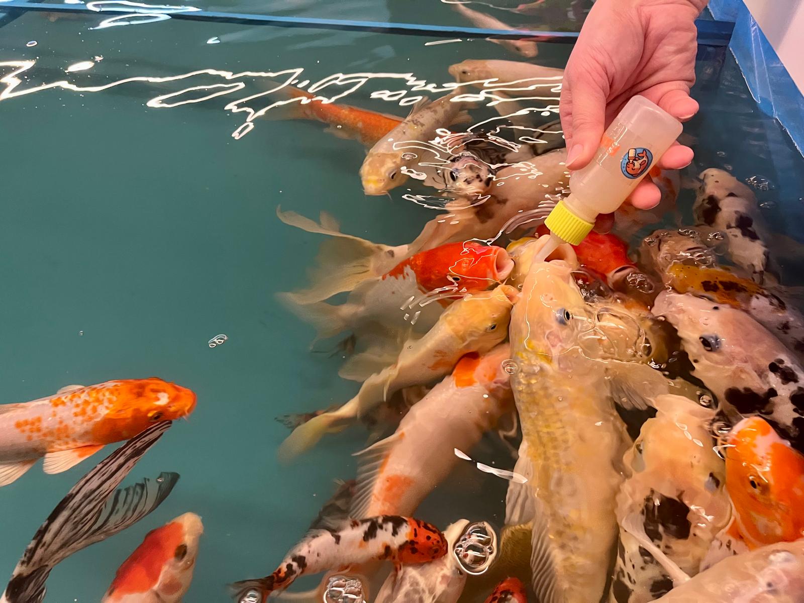 Adetini 200 TL’ye sattığımız 50 cc biberonların içinde yer alan tarafımızca özel hazırladığımız sıvı balık mamalarıyla Japon koi balığını besleyen çocuklar, burada ebeveynleriyle yaklaşık yarım saat eğlenceli vakit geçiriyorlar. Biberonların yarısını çocuklar, diğer yarısını da ebeveynlerin dayanamayarak çocuklarından alıp kendilerinin beslediklerini de görüyoruz. Besleme görevli personel nezaretinde oluyor. Biberon uçları her seans sonrası sterilize ediliyor. Aşırı beslemeye de izin verilmiyor.