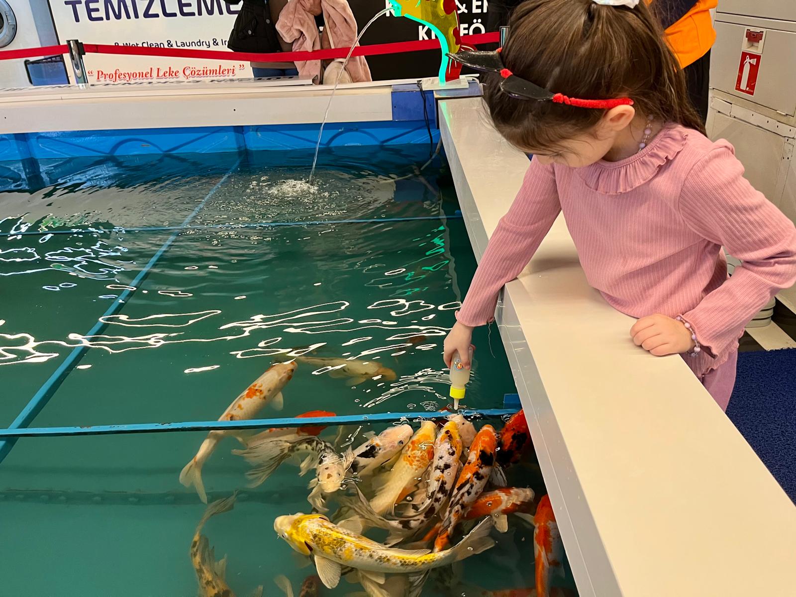 İki personelimiz sürekli çocukları gözetim altında tutuyorlar, çocukların balıklarla ilişki kurması ile alakalı kolaylık sağlıyorlar, çünkü korkan çocuklar oluyor balıklar büyük olduğu için… Balıklara çocuklar o kadar yaklaşıyor ki parmaklarını sokmamaları için tutuyoruz. Yurt içi ve yurt dışından temin ettiğimiz Japon koi balıklarımızla burada 3 aylık hizmet vermekteyiz, yani 3 aylık bir işletmeyiz.