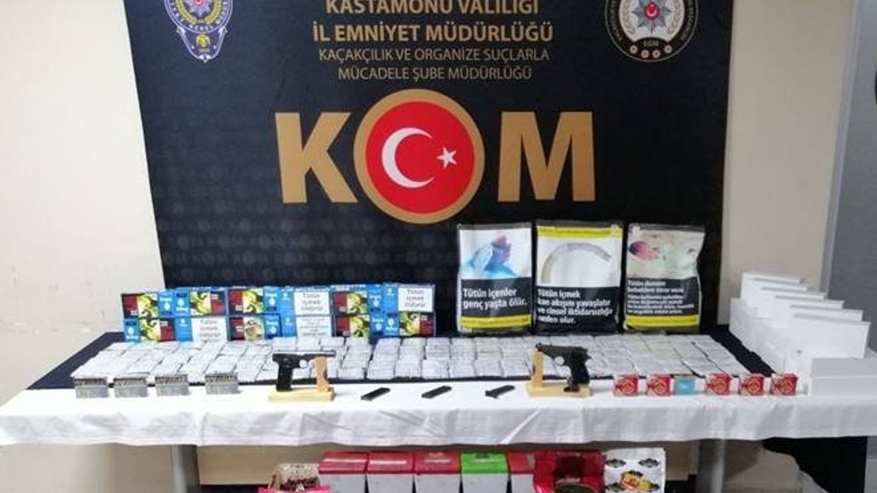 Edinilen bilgiye göre, Kastamonu İl Emniyet Müdürlüğü Kaçakçılık ve Organize Suçlarla Mücadele (KOM) Şube Müdürlüğü ekiplerince, kaçak tütün ve yan sigara ürünleri bulundurulduğu belirlenen 2 ev, 1 işyeri ve 1 depoda arama yapıldı. Aramalarda 2 adet ruhsatsız tabanca, 1 adet av tüfeği, 130 adet tabanca fişeği, 3 adet elektronik sigara sarma makinası, 6 bin 460 adet doldurulmuş makaron, 15 bin 350 adet boş makaron, 29 kilogram açık kıyılmış tütün, 9 paket nargile tütünü, 6 kilogram nargile melası ele geçirildi.