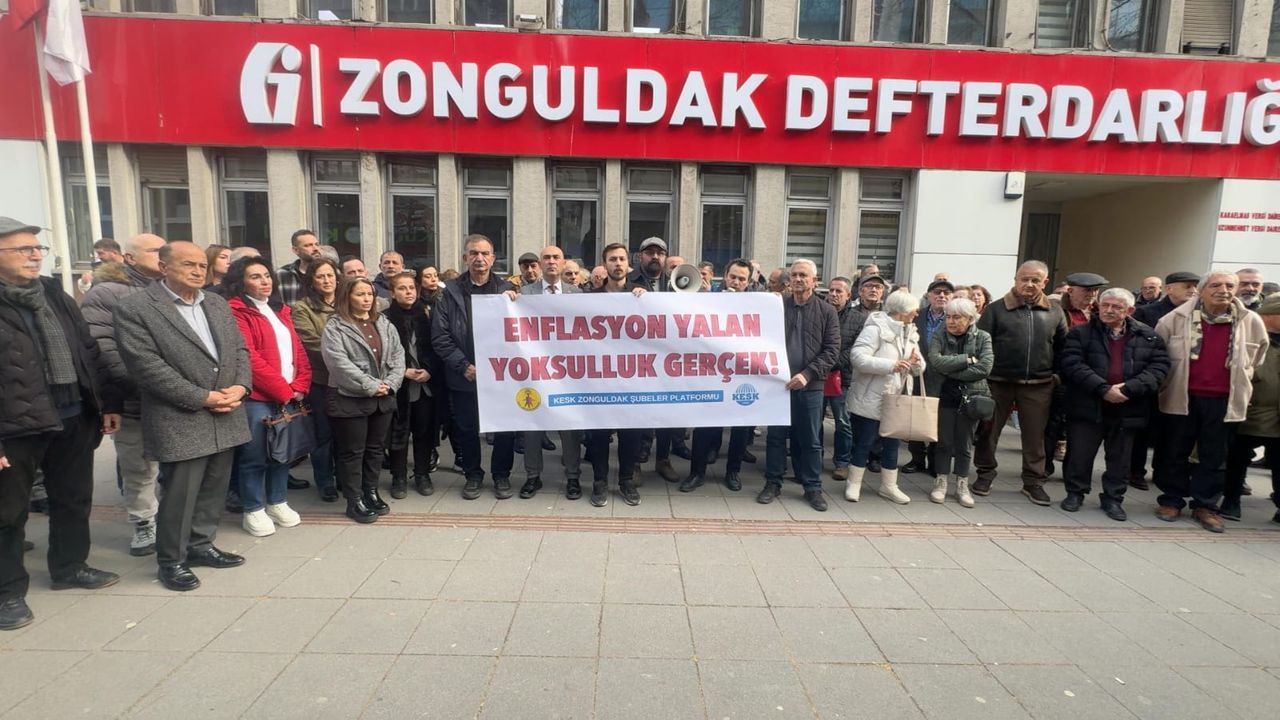 KESK’e bağlı sendikaların başkan ve yöneticileri, Zonguldak Vergi Dairesi önünde basın açıklaması düzenledi. Açıklamayı yapan KESK Dönem Sözcüsü Özgür Erkal, kamu emekçilerinin, emeklilerin ve emeğiyle geçinen milyonların her geçen gün daha fazla yoksullaştırıldığını vurgulayarak, “TÜİK yalanına teslim olmayacağız, insanca bir yaşam için iş bırakıyoruz” dedi.