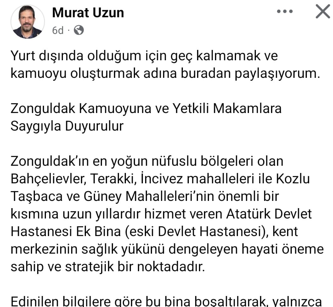 AK Parti önceki dönem Zonguldak Belediye Meclis Üyesi ve iş insanı Murat Uzun, sosyal medya hesabından yaptığı açıklamayla kamuoyunu önemli bir konuda uyardı. Yurt dışında bulunduğunu belirten Uzun, Zonguldak Atatürk Devlet Hastanesi Ek Bina’nın boşaltılarak Göğüs Hastalıkları Hastanesi’nin buraya taşınmasının planlandığını dile getirdi ve bu durumun şehir adına ciddi sonuçlar doğurabileceğini söyledi.