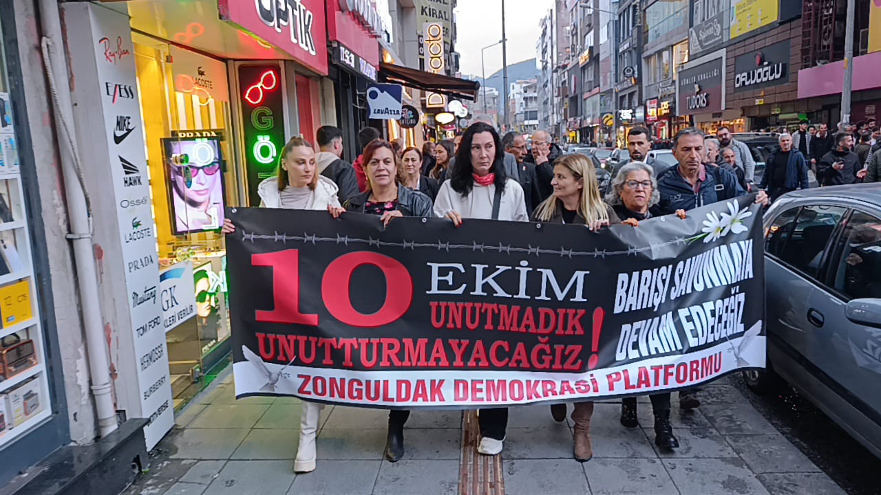 Anma etkinliği, Zonguldak Maden Mühendisleri Odası önünde gerçekleştirilen basın açıklamasıyla başladı. Açıklamanın ardından katılımcılar, sloganlar eşliğinde Makine Mühendisleri Odası’na kadar yürüdü. Burada 10 Ekim Katliamı’nı anlatan belgesel izlendi.