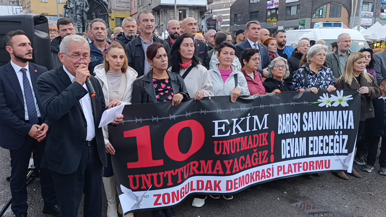 Zonguldak Demokrasi Platformu ve Cumartesi Platformu üyeleri, 10 Ekim 2015’te Ankara Garı önünde düzenlenen ve 103 kişinin yaşamını yitirdiği katliamın onuncu yıldönümünde bir araya geldi.