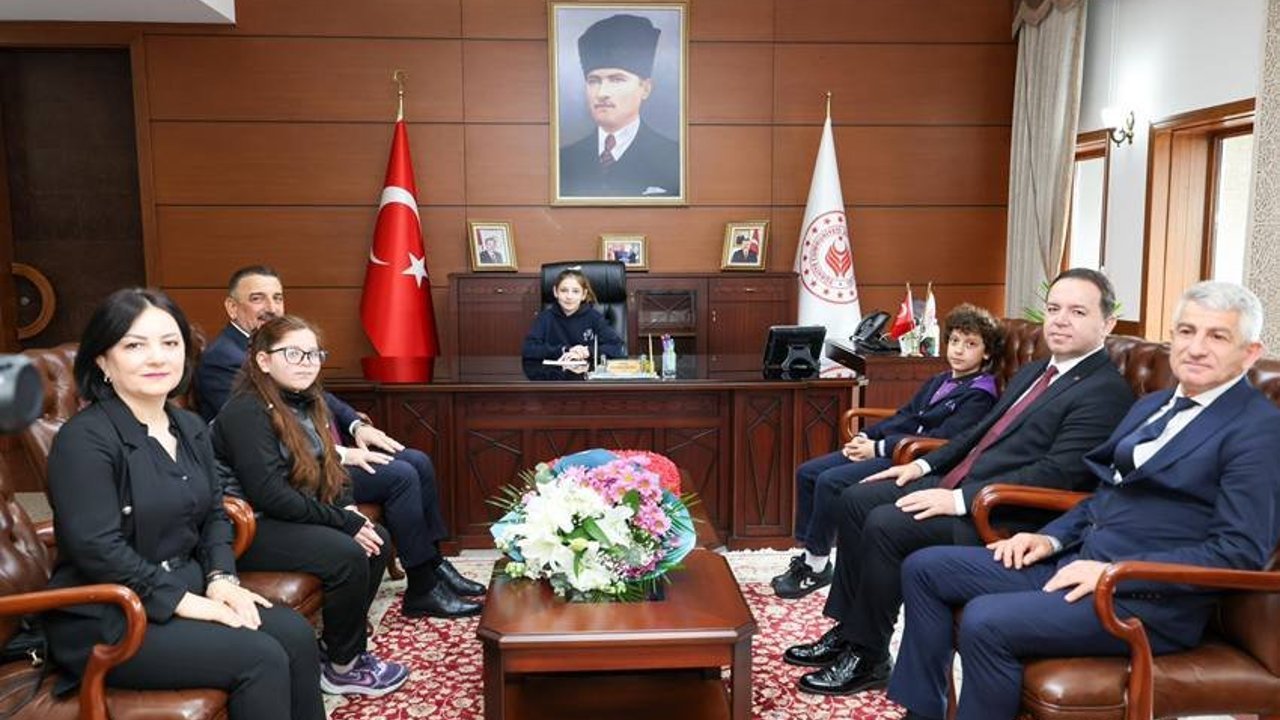 Ziyaret kapsamında İl Milli Eğitim Müdürü Uygar Keskin ile birlikte İbrahim Fikri Anıl Ortaokulu öğrencileri Gülsüm Öztürk, Miraç Karamehmethoğlu ve Zeynep Nisa Fidan, öğretmenleri Filiz Altun Keleş ve Okul Müdürü Yakup Balçın eşliğinde Valilik makamını ziyaret etti.