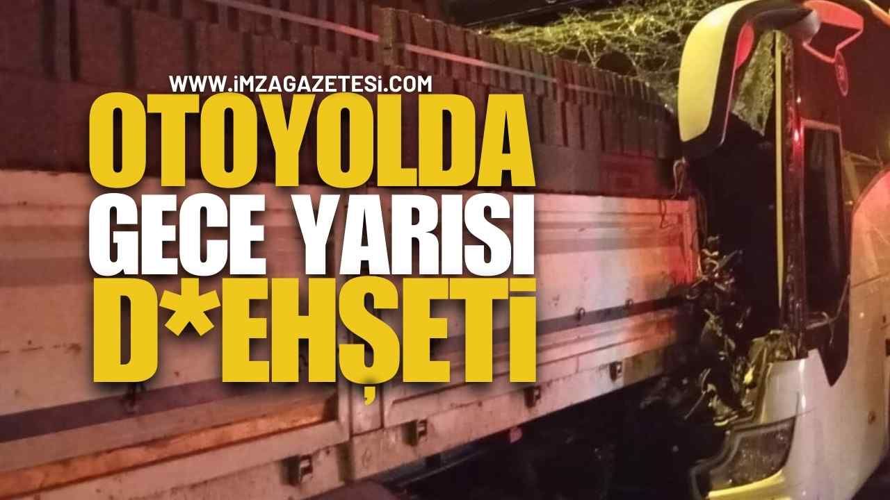 Çarpışmanın şiddetiyle otobüsün ön bölümü büyük hasar alırken, otoyolda can pazarı yaşandı.