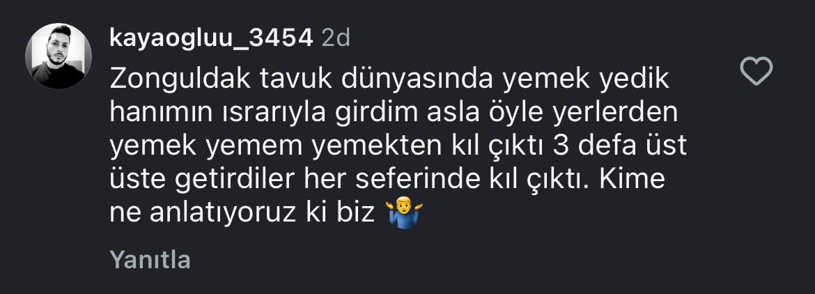 Şikayette bulunan müşteri, eşinin ısrarıyla girdiği mekanda yaşadığı olayı şu sözlerle anlattı: "Zonguldak Tavuk Dünyası'nda yemek yedik. Hanımımın ısrarıyla girdim, asla öyle yerlerden yemek yemem. Yemekten kıl çıktı. 3 defa üst üste getirdiler, her seferinde kıl çıktı."