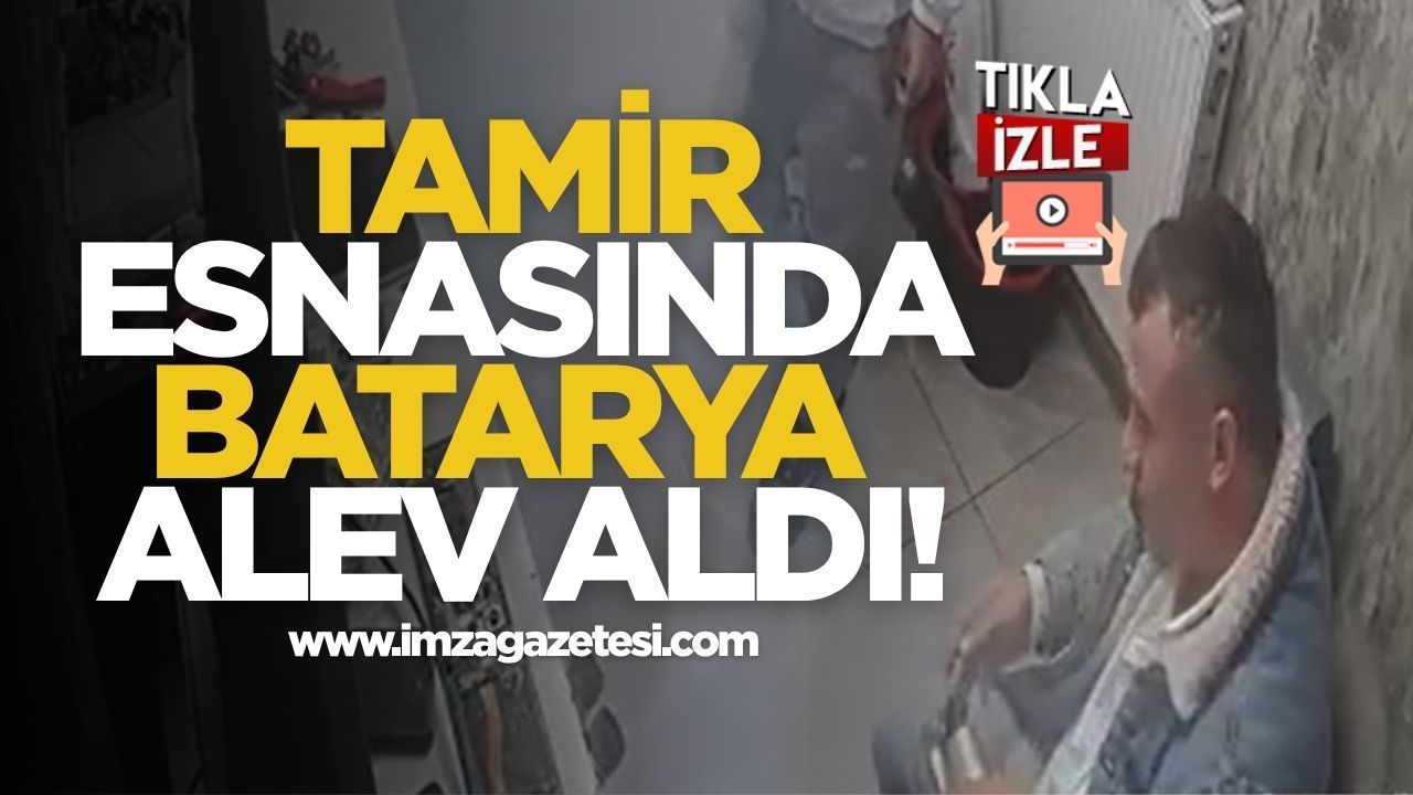 Tamir sırasında bataryanın aniden alev alması güvenlik kameralarına yansırken, soğukkanlı davranan Acar, yangının büyümesini engelledi ve vatandaşları orijinal ürün kullanmaları konusunda uyardı.