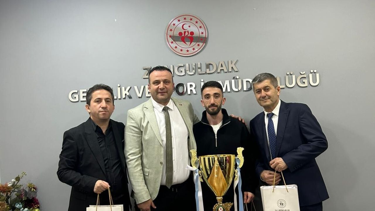 Kulüp Başkanı Serkan Göktaş ve yönetim kurulu üyeleri, şampiyonluk kupasıyla birlikte Zonguldak Gençlik ve Spor İl Müdürü Halil Hacı ile Spor Hizmetleri Müdürü Serkan Keleş’i ziyaret etti.