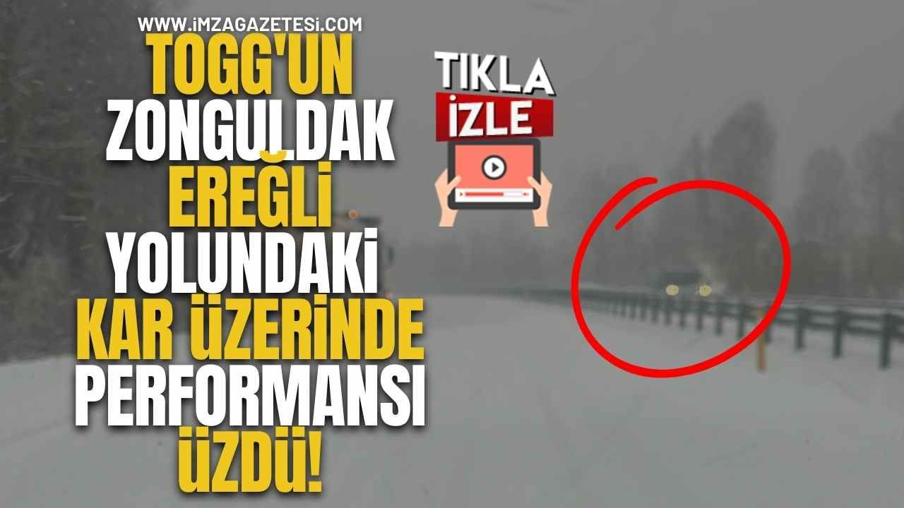 Çok sayıda aracın mahsur kaldığı yolda, yerli otomobil Togg’un karlı zemindeki zor anları ve yalpalayarak ilerlemesi sürücüleri üzdü.