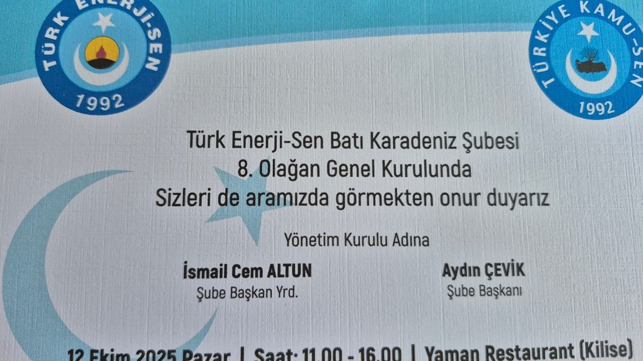 Türk Enerji-Sen Batı Karadeniz Şubesi’nin 8. Olağan Genel Kurulu 12 Ekim 2025 Pazar günü gerçekleştirilecek.