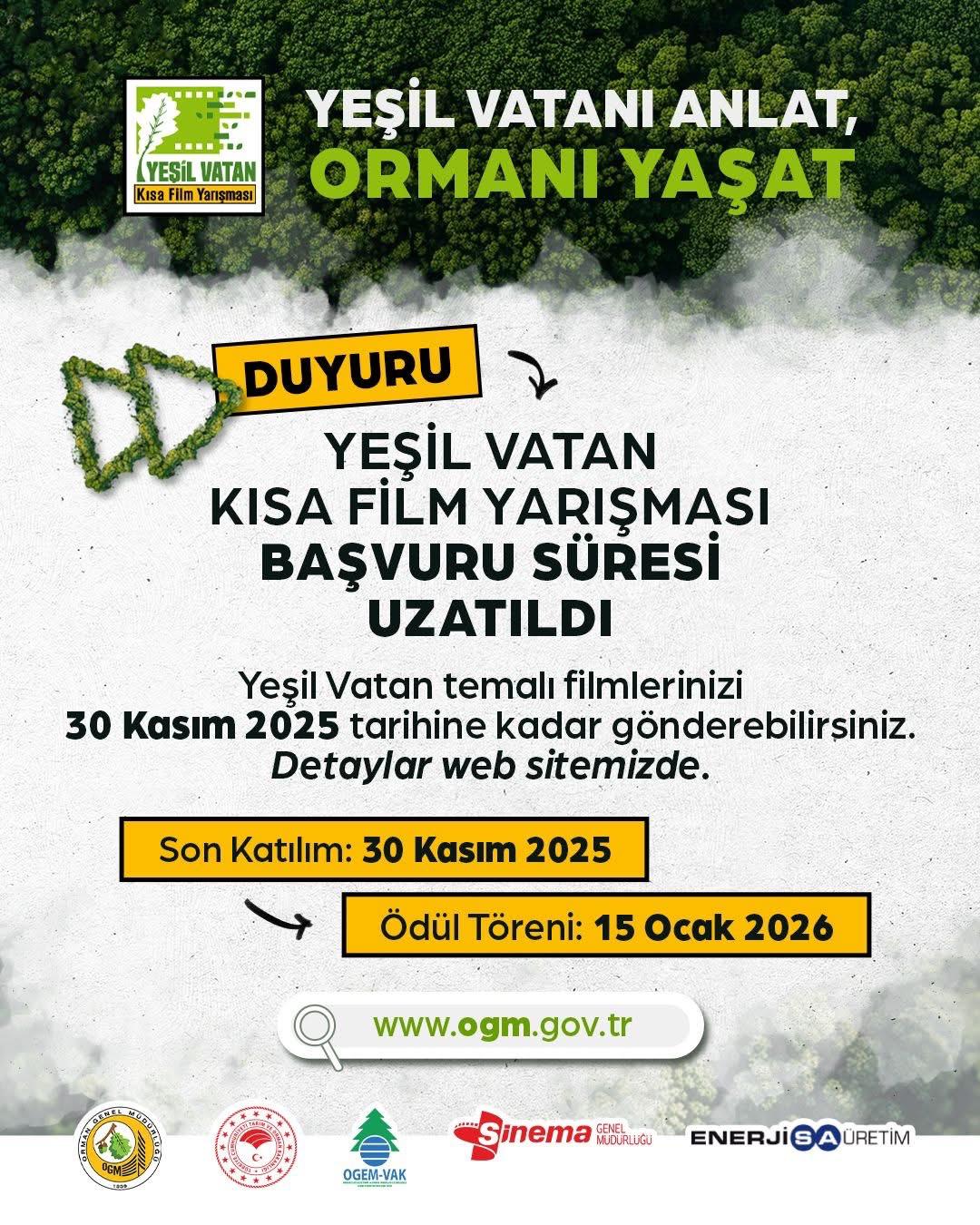 “Size göre Yeşil Vatan’ın ne demek olduğunu izah edebileceğiniz kısa film yarışmamıza gelen yoğun başvuru ve süre uzatımı talebi, Milli Eğitim Bakanlığımızın kasım ayını ‘Orman Ayı’ ilan etmesiyle birlikte 11 Kasım Milli Ağaçlandırma Günü’nün de yarışmaya katılacak eserlerde yer alabilmesi amacıyla son başvuru tarihi 30 Kasım 2025’e kadar uzatılmıştır.