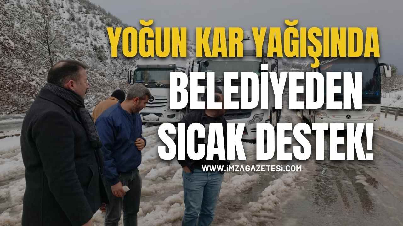 İlçemizi ve bölgemizi olumsuz etkileyen yoğun kar yağışı nedeniyle, trafik güvenliğini sağlamak amacıyla büyük araçların geçişine geçici olarak izin verilmedi. Soğuk ve karlı kış günlerinde vatandaşların yanında olan belediyemiz, zorlu hava koşullarında yolda kalan ve seyir halindeki vatandaşlara destek sağladı.