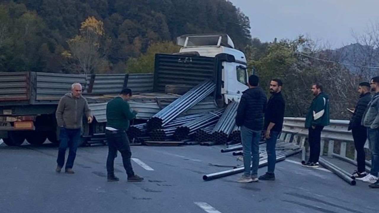 Zonguldak-Ereğli karayolunda meydana gelen kazalara bir yenisi daha eklendi. Bugün akşam saatlerinde Ereğli'den Zonguldak istikametine gelmekte olan demir yüklü Tır kayarak yan döndü. Kaza sonrası Tır'daki demirler yola saçılırken yaralanan olmadı.