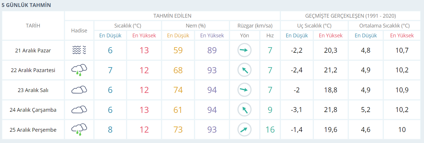 21 Aralık Pazar: Haftanın ilk gününde sıcaklıklar 6°C ile 13°C arasında. Nem oranı akşam saatlerinde %89’a kadar çıkarak hissedilen serinliği artırabilir.